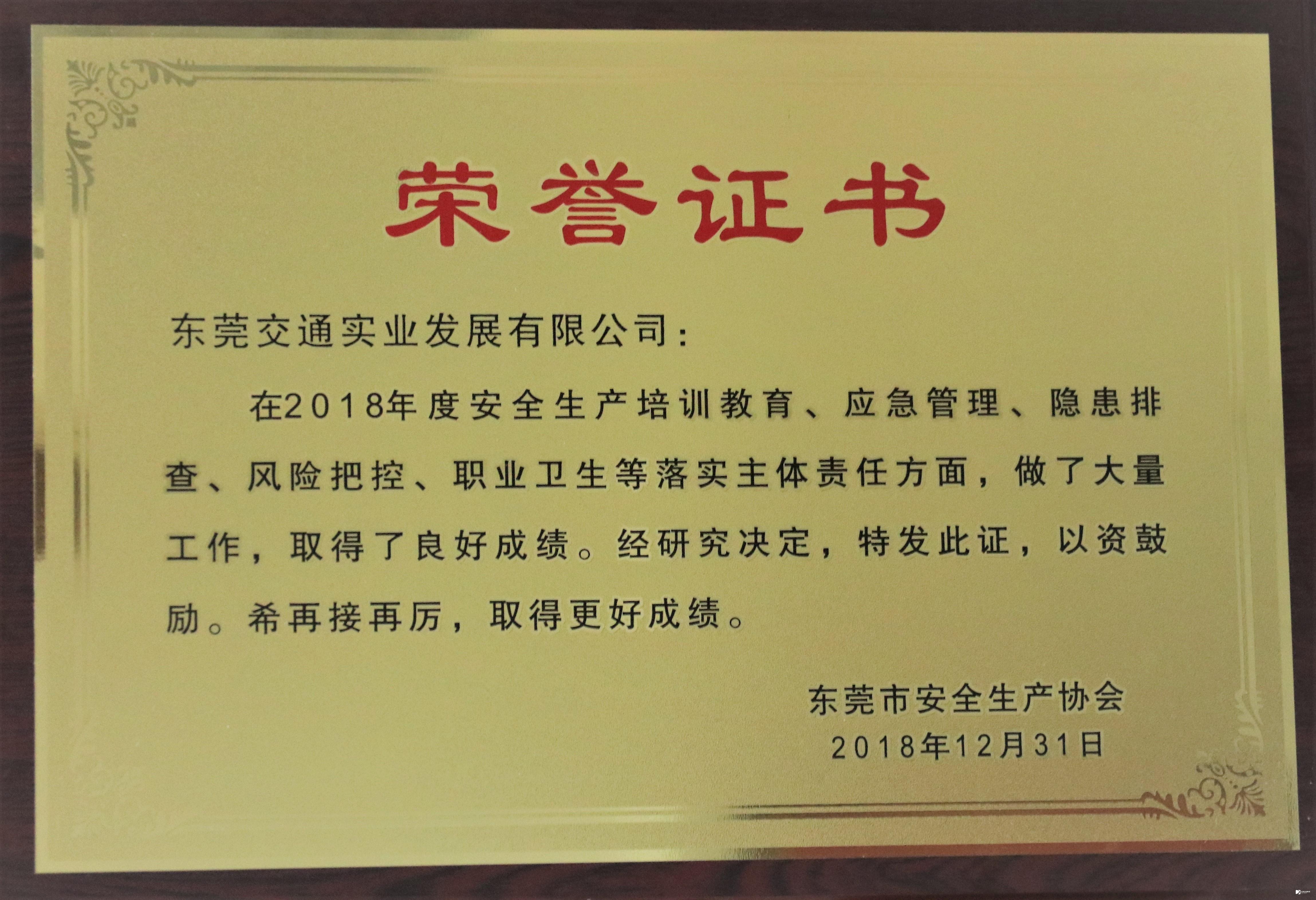 2018年12月,交通實(shí)業(yè)公司獲東莞市安全生產(chǎn)協(xié)會(huì)頒發(fā)2018年企業(yè)安全生產(chǎn)工作突出成績(jī)獎(jiǎng)。