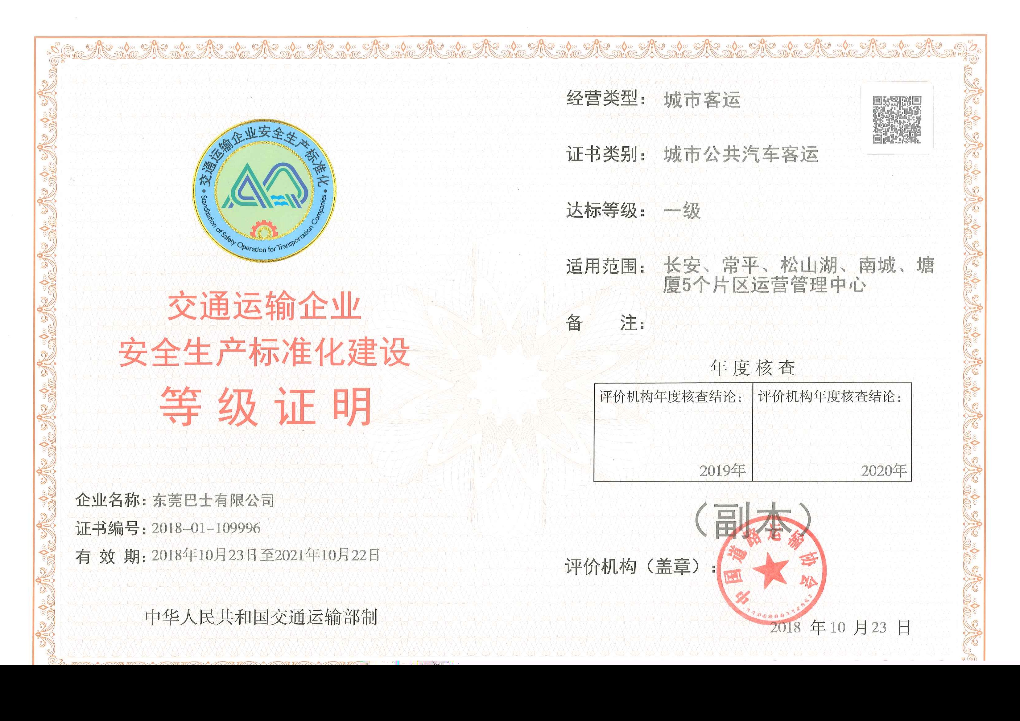 2018年10月,東莞巴士公司被中國(guó)道路運(yùn)輸協(xié)會(huì)評(píng)為城市公共汽車客運(yùn)安全標(biāo)準(zhǔn)化一級(jí)達(dá)標(biāo)企業(yè)。