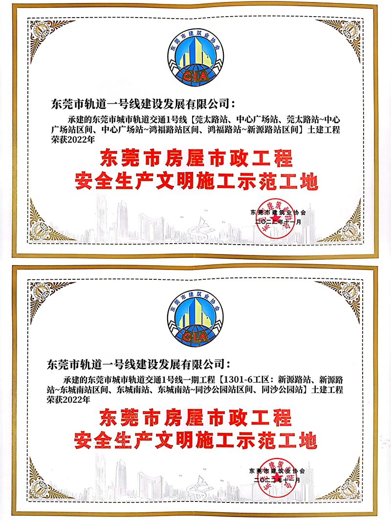 2022年11月,東莞市建筑業(yè)協(xié)會(huì)授予軌道一號(hào)線公司“東莞市房屋市政工程安全生產(chǎn)文明施工示范工地”榮譽(yù)稱號(hào)