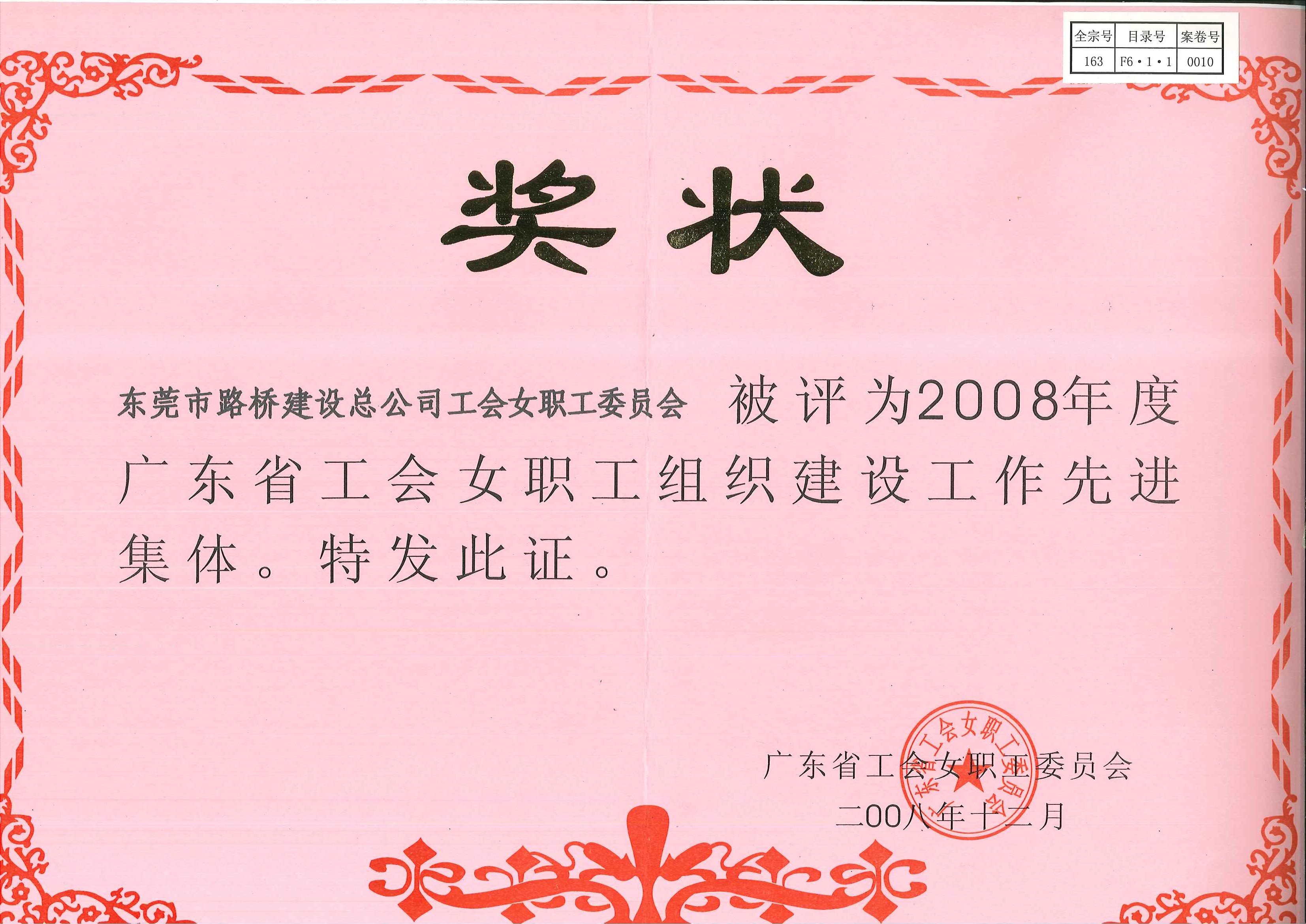 2008年12月24日,市路橋總工會女職工委員會被評為“2008年度廣東省工會女職工組織建設(shè)工作先進集體”。