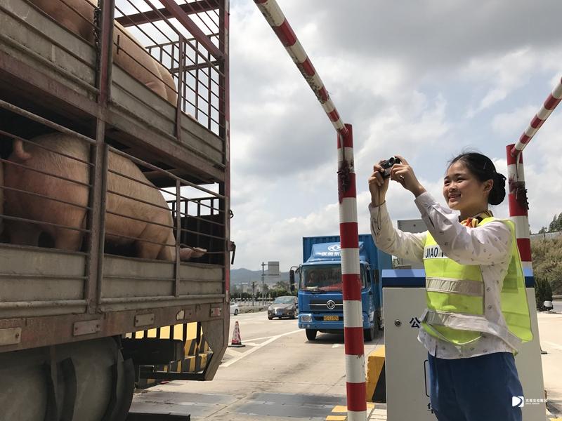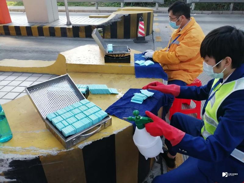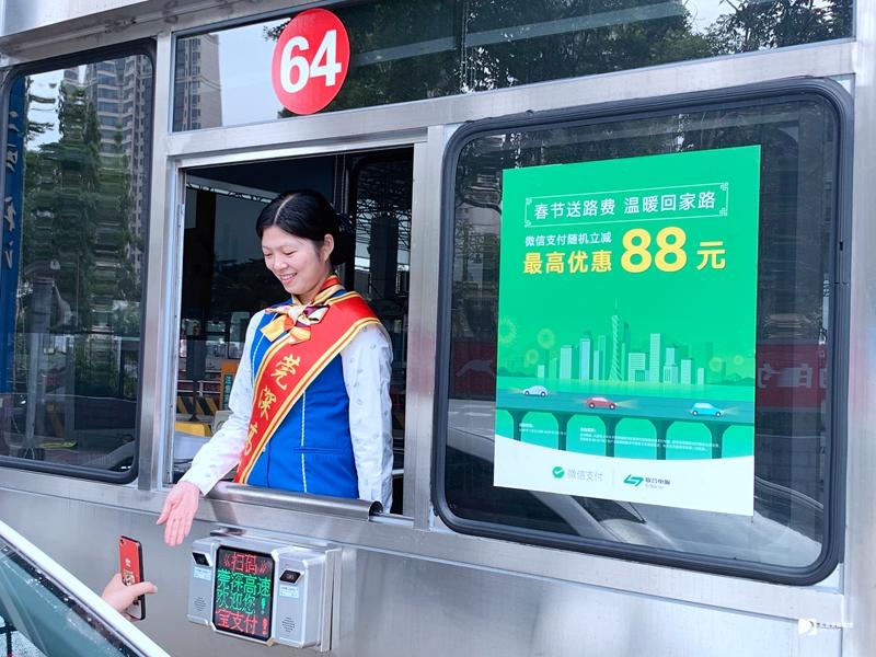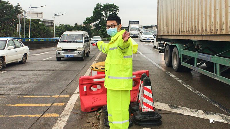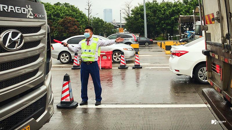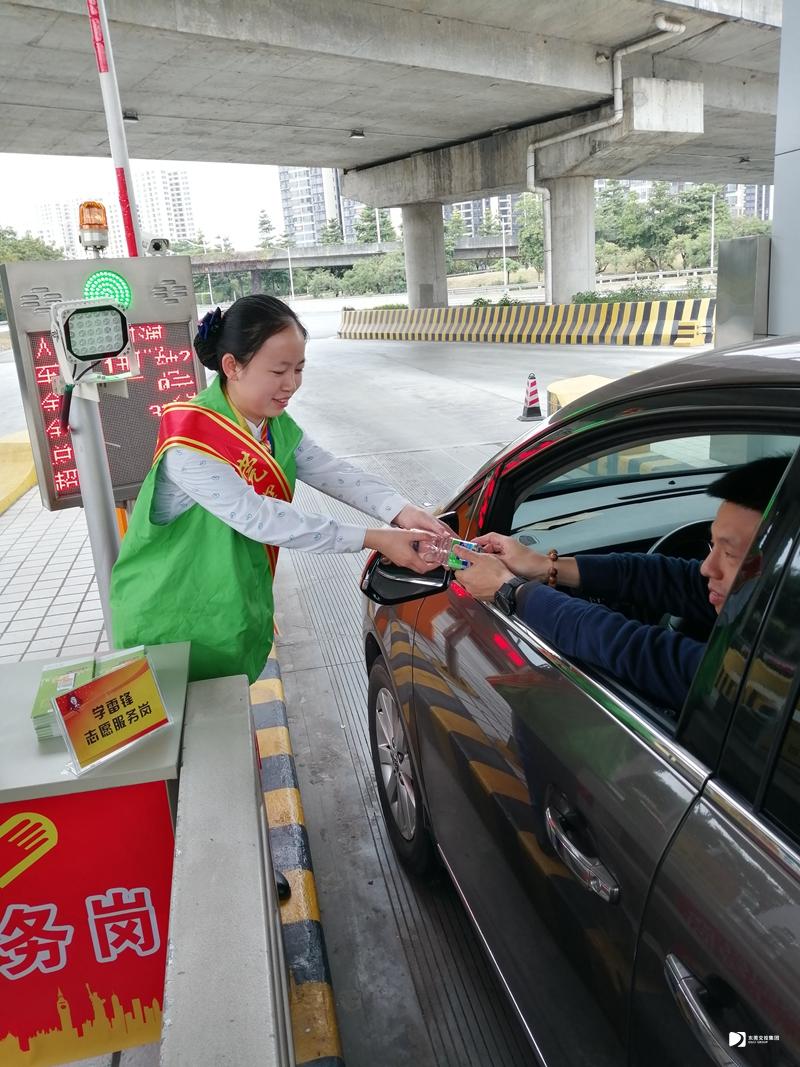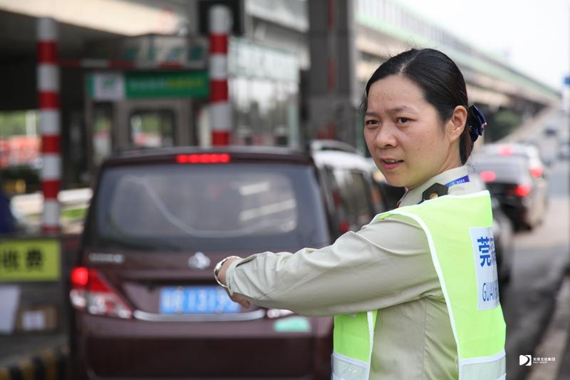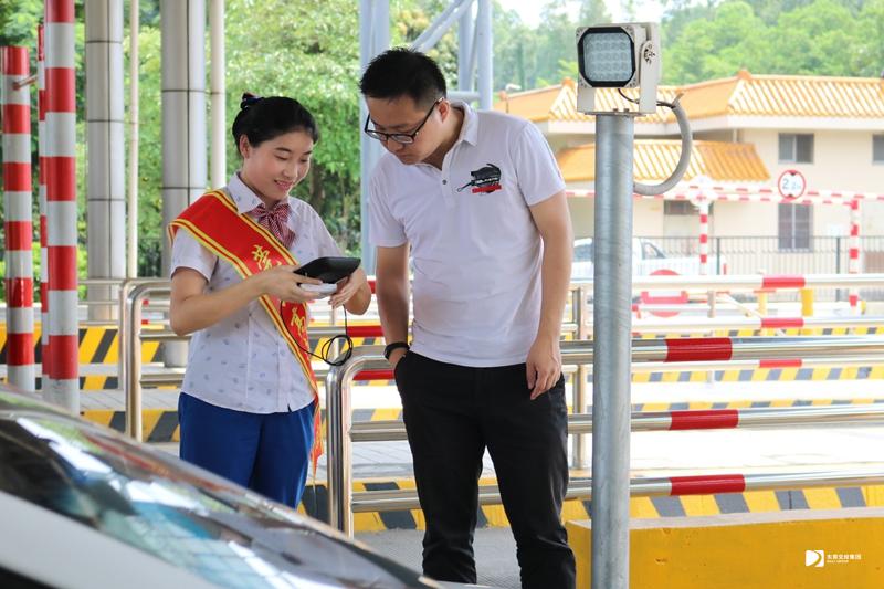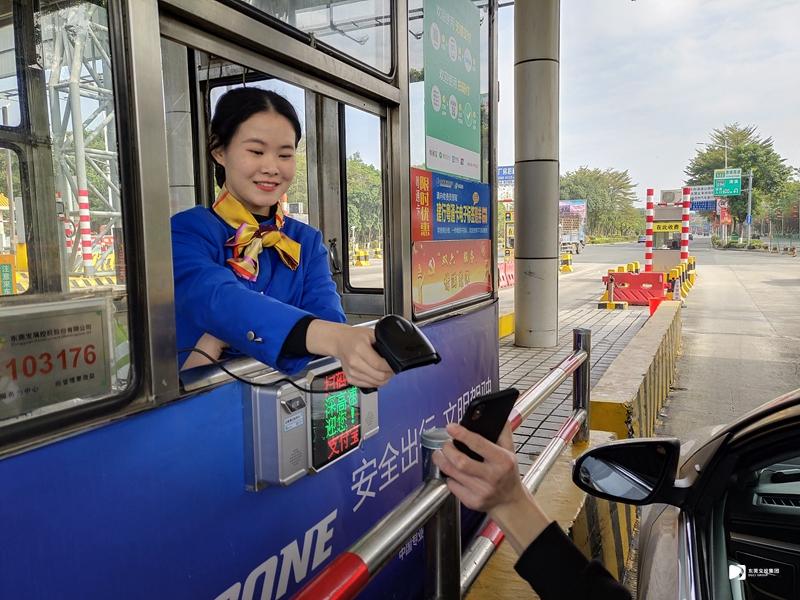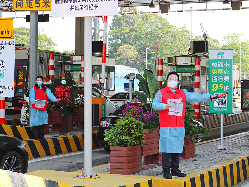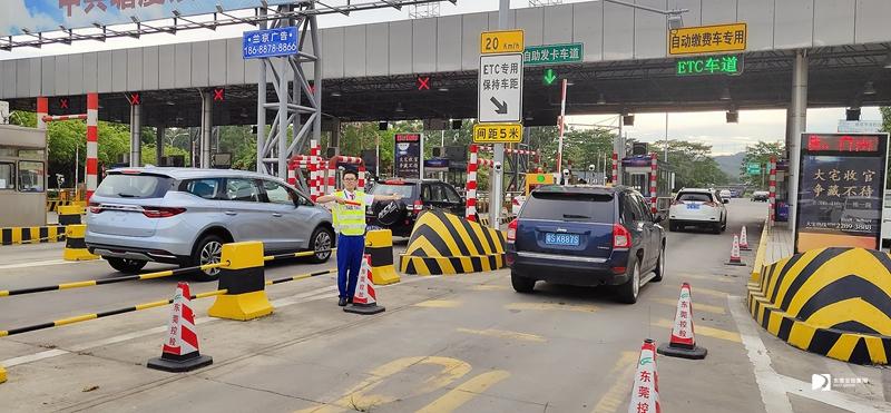 東莞控股公司志愿者在莞深高速所轄收費(fèi)站引導(dǎo)司乘人員有序掃碼通行