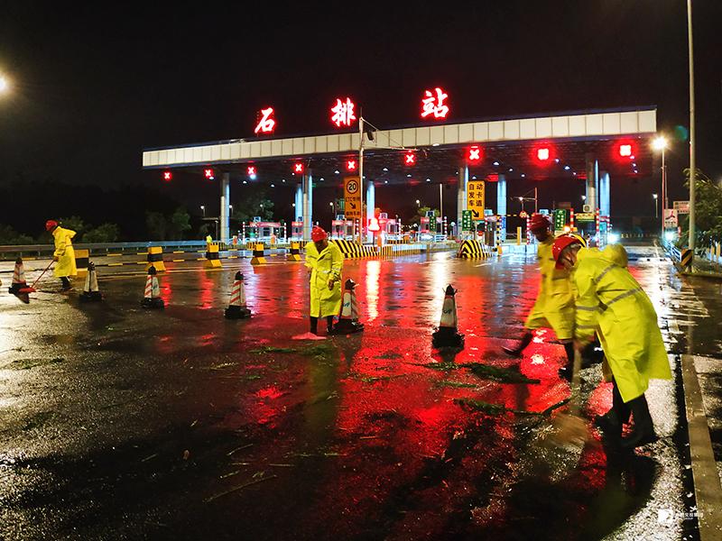 臺(tái)風(fēng)山竹吹襲期間,?;⒎止臼召M(fèi)人員清掃收費(fèi)廣場(chǎng)