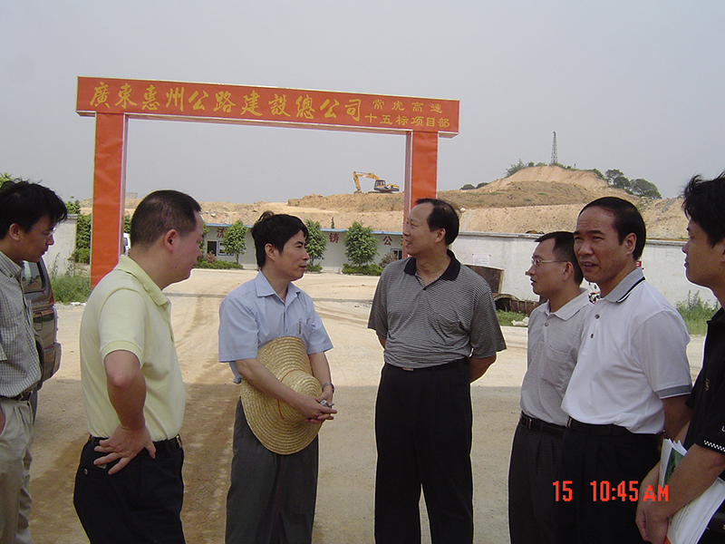 2004年6月15日,時(shí)任省交通廳陳冠雄副廳長(zhǎng)(左三)在路橋總公司總經(jīng)理鐘旭堆(右四)的陪同下視察常虎高速公路建設(shè)情況。