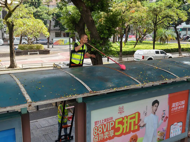 全面清潔煥新:對986座公交站亭進行精細化深度清潔,重點清除頂棚苔蘚、燈箱積塵及各類小廣告,全面提升站亭潔凈度,讓公交站亭煥然一新。