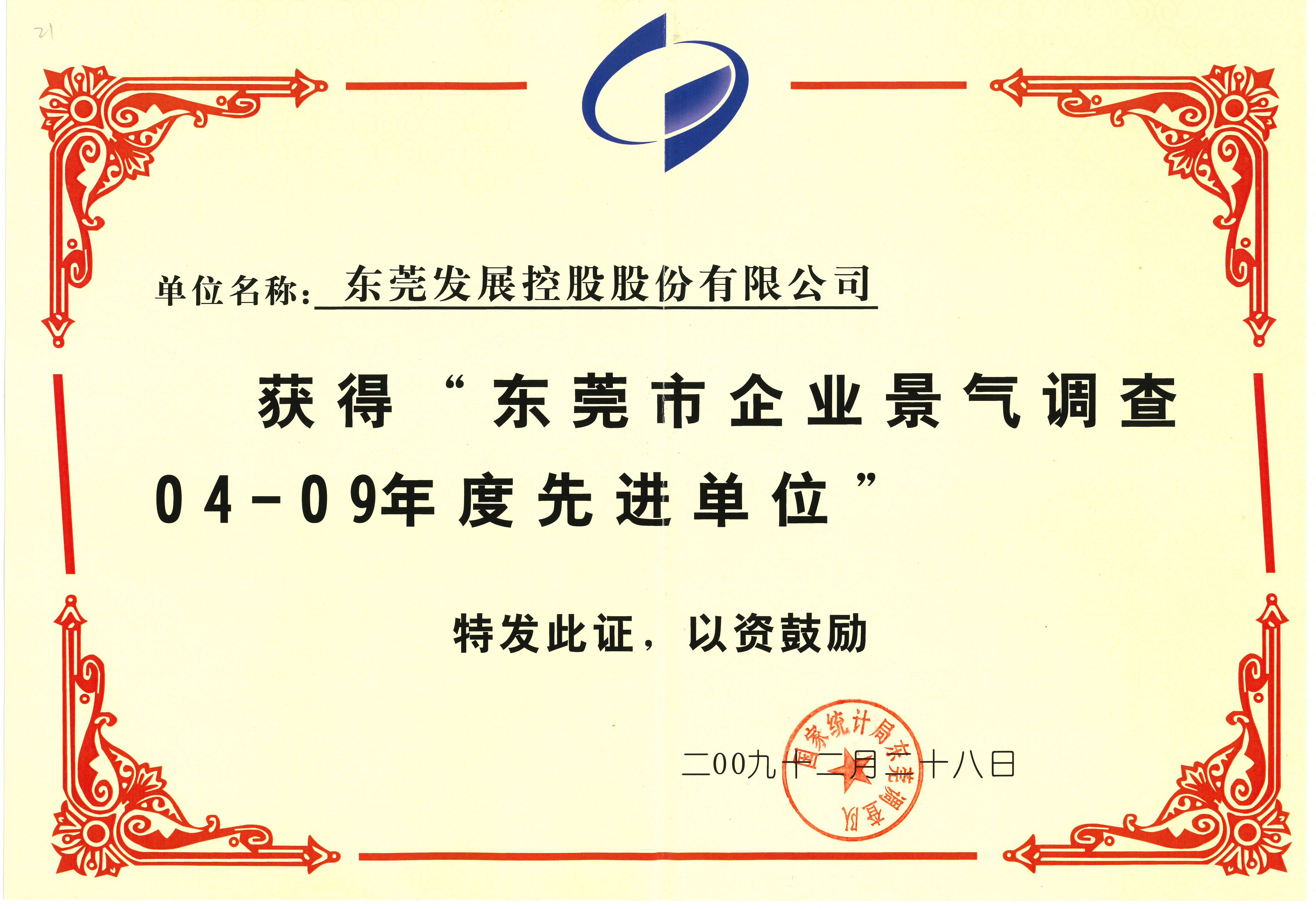 2009年12月,東莞控股公司榮獲“東莞市企業(yè)景氣調(diào)查2004-2009年度先進(jìn)單位”榮譽(yù)稱號(hào)。