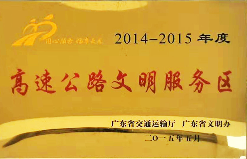 2015年5月,廣東省交通運(yùn)輸廳、廣東省文明辦授予東莞控股公司2014-2015年度“高速公路文明服務(wù)區(qū)”榮譽(yù)稱號(hào)。