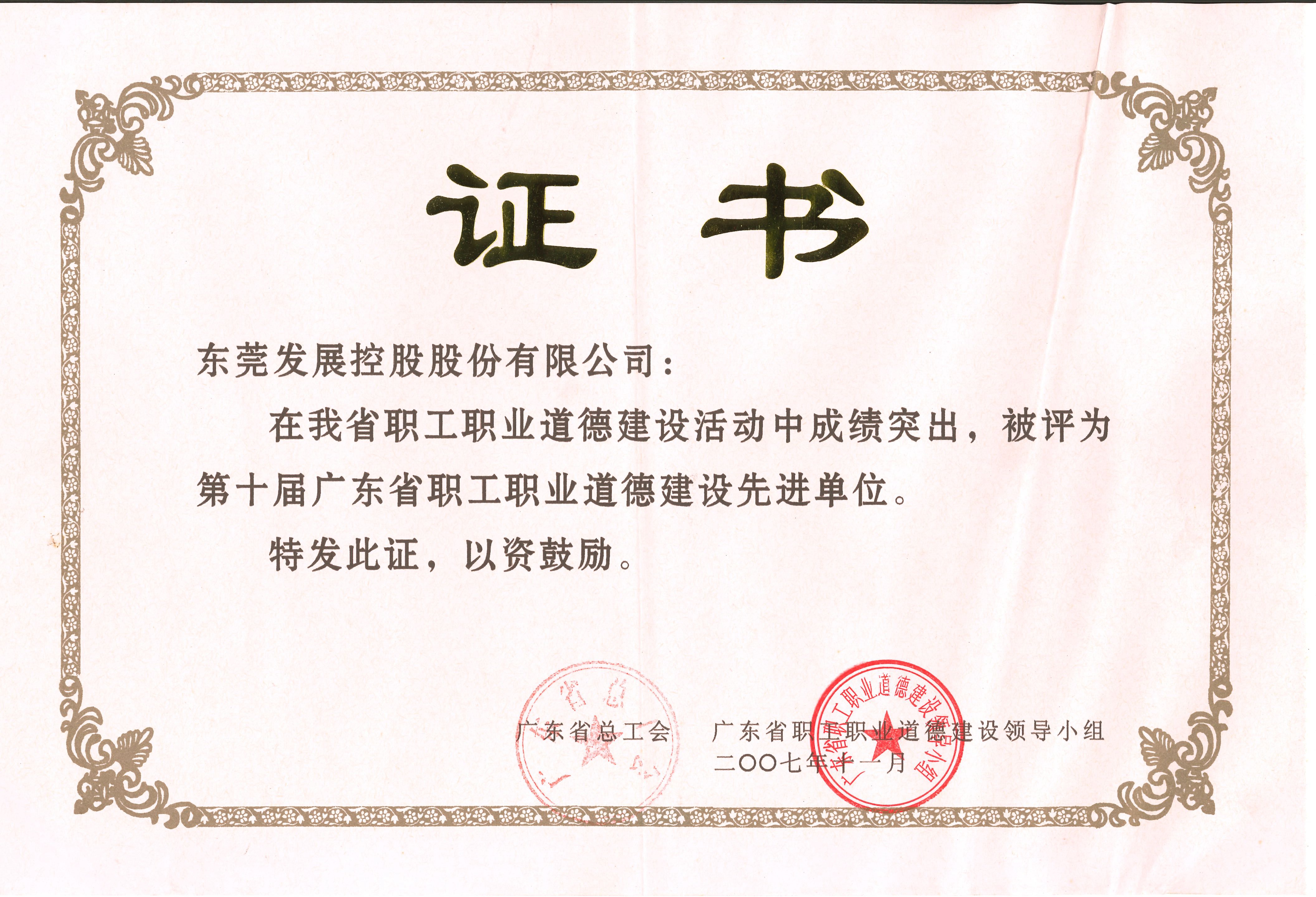 2007年11月,東莞控股公司被廣東省總工會(huì)、廣東省職工職業(yè)道德建設(shè)領(lǐng)導(dǎo)小組評(píng)為第十屆廣東省職工職業(yè)道德建設(shè)先進(jìn)單位。