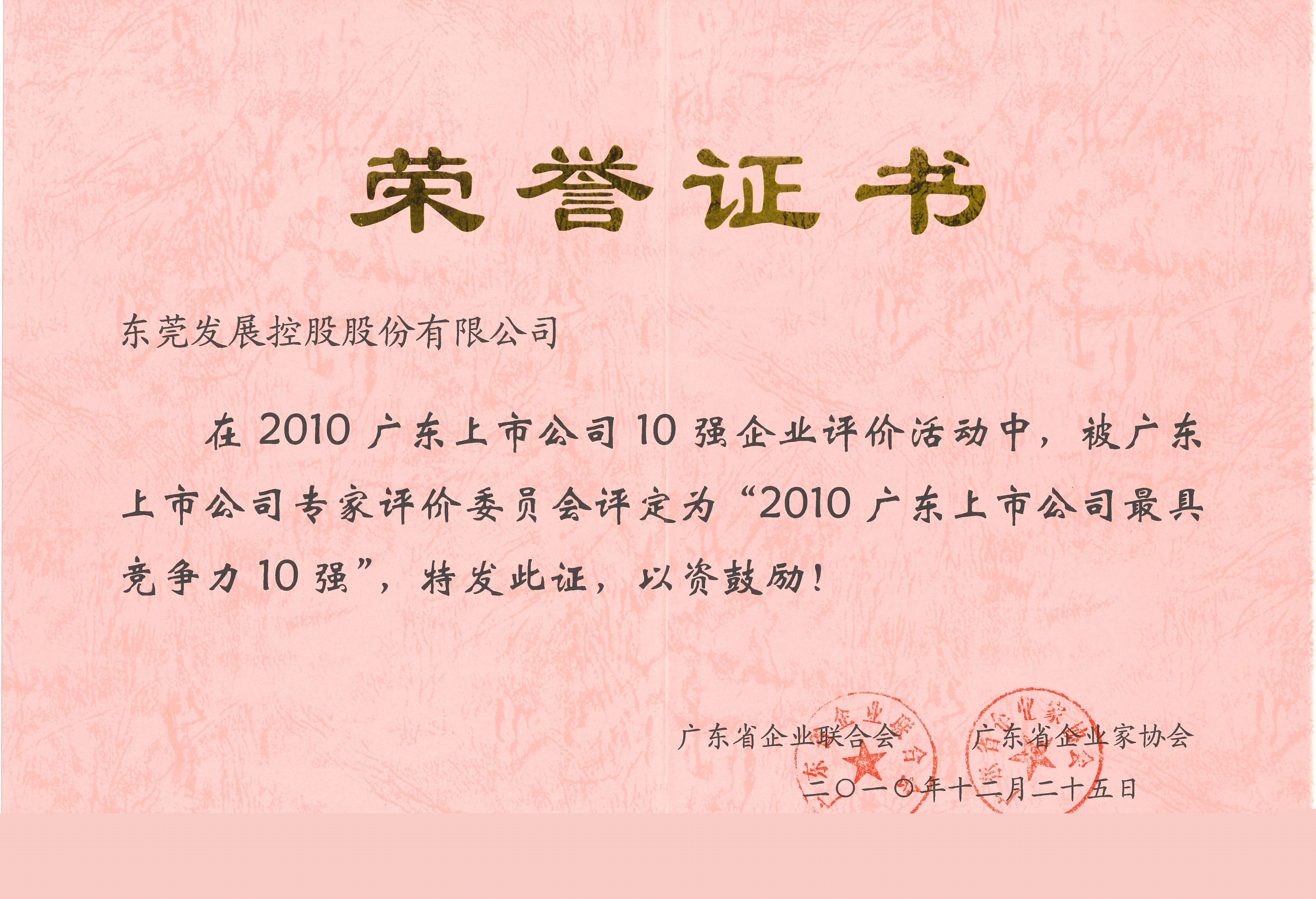 2010年12月,東莞控股榮獲“2010廣東上市公司最具競(jìng)爭(zhēng)力10強(qiáng)”榮譽(yù)稱號(hào)。