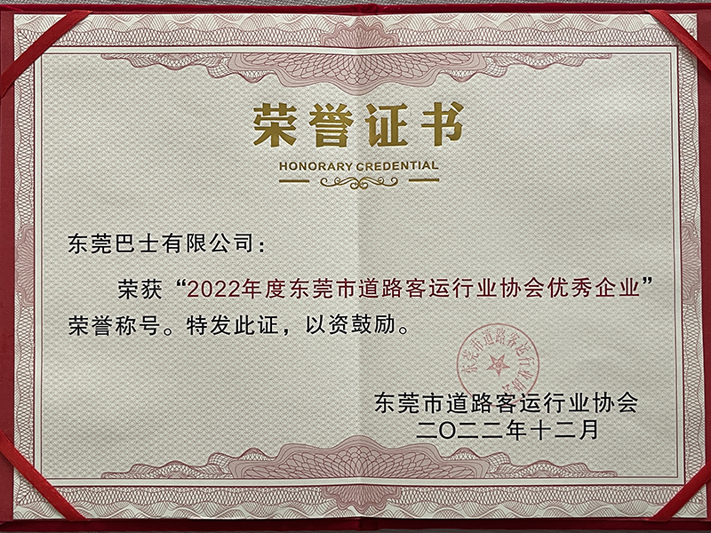 2022年12月,東莞巴士有限公司榮獲2022年度東莞市道路客運(yùn)行業(yè)協(xié)會(huì)優(yōu)秀企業(yè)證書