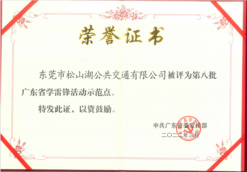 2022年3月,中共廣東省宣傳部授予東莞市松山湖交通有限公司2022年“第八批廣東省學(xué)雷鋒活動(dòng)示范點(diǎn)”稱號(hào)
